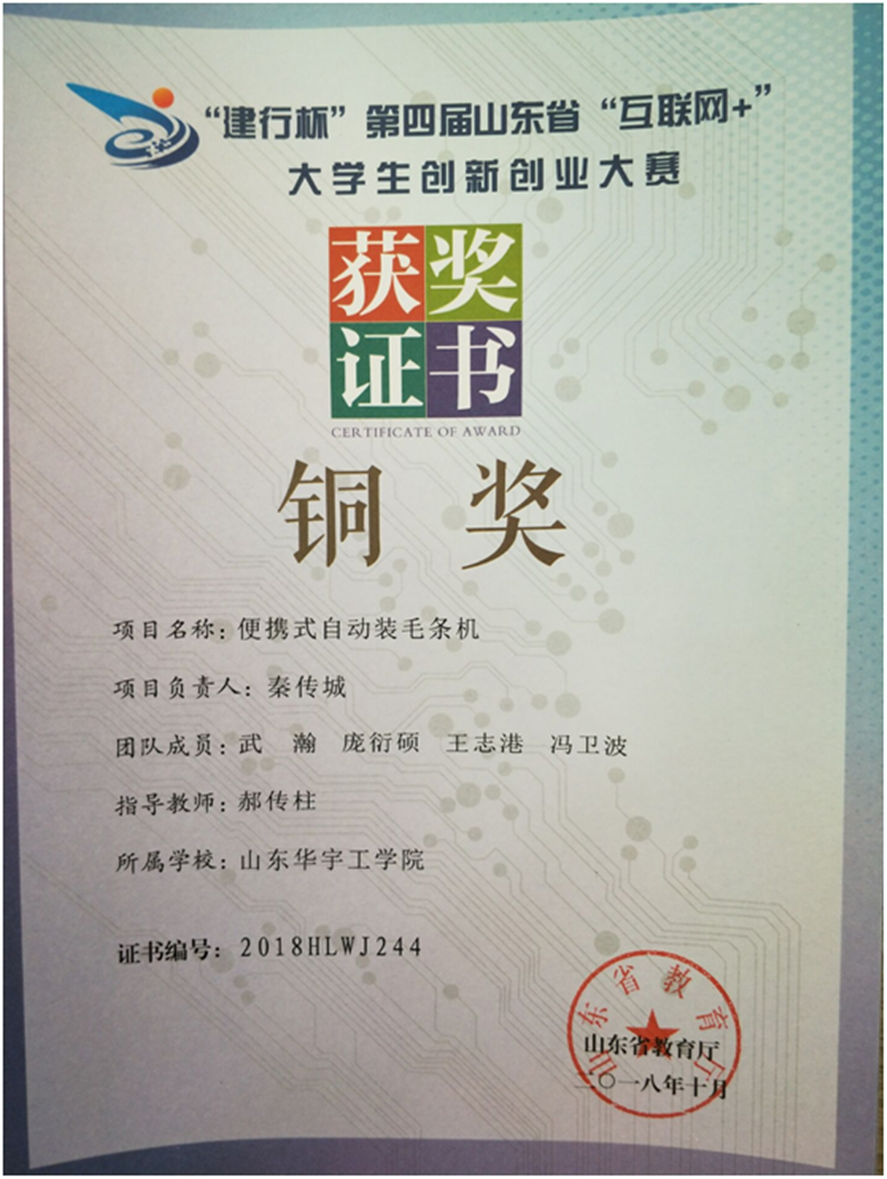 近日,山东省教育厅、山东省财政厅公布了“建行杯”第四届山东省“互联网+”大学生创新创业大赛获奖结果,beat365官网便携式自动装毛条机项目获铜奖,这是beat365官网参加山东省“互联网+”大学生创新创业大赛并斩获大奖,实现了学校在该项赛事中的突破。